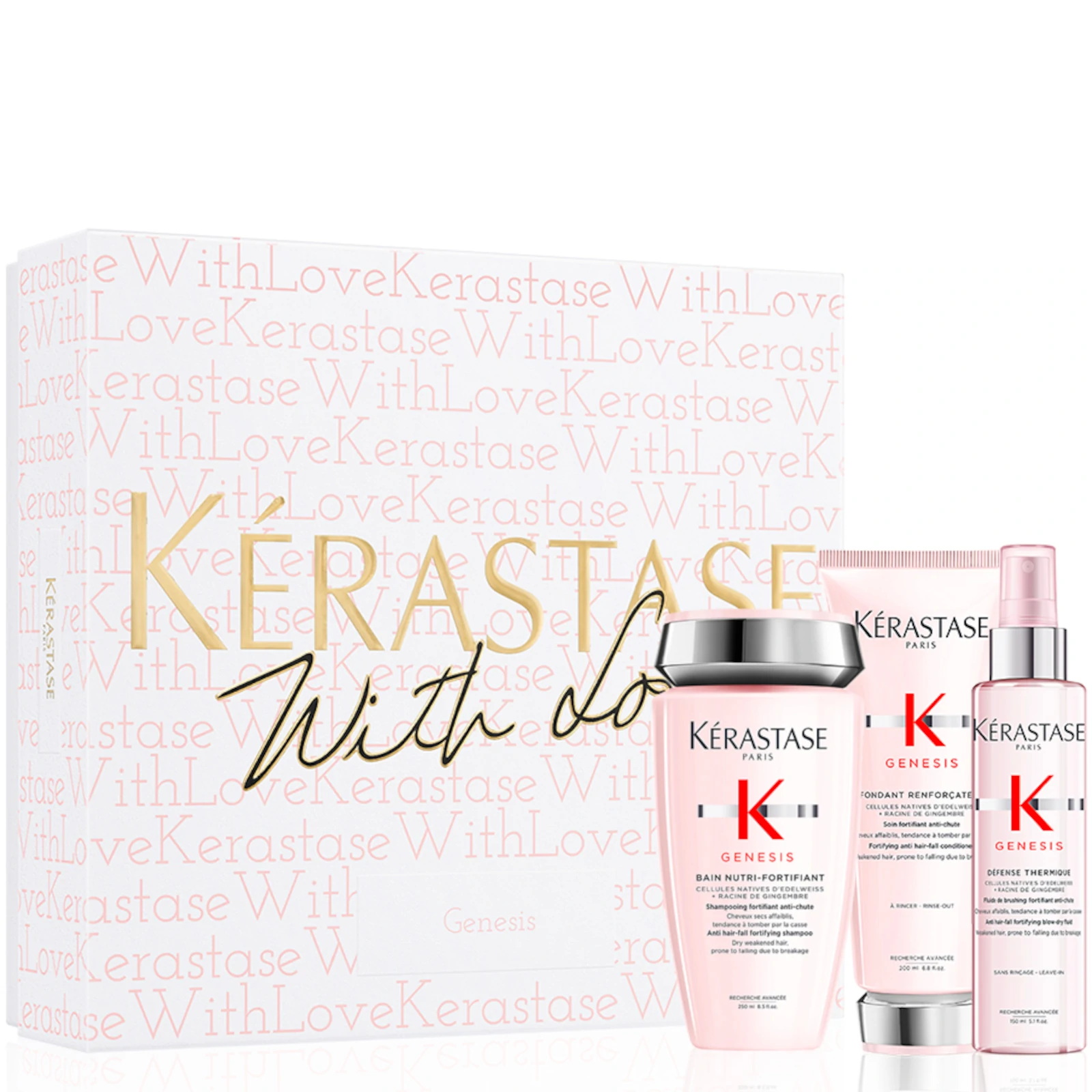 Kérastase genesis trio anti-hair fall gift set is the perfect luxury Christmas gift set against hair fall. The set contains the Kérastase genesis bain hydra-fortifying shampoo 250ml, the Kérastase genesis fondant fortifying conditioner 20ml, and the Kérastase genesis fortifying blow dry heat protectant 150ml.