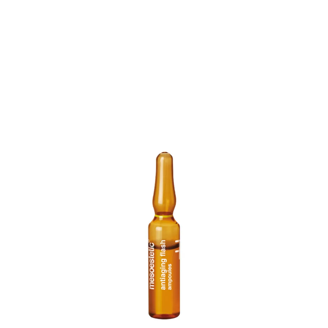 Mesoestetic Antiaging Flash Ampoules is an anti-aging treatment indicated for photoaging skin. It is intended to treat wrinkles, lack of luminosity and loss of firmness. Thanks to the combination of a Vegetable Tensor ingredient that increases elasticity and exerts an instant anti-wrinkle effect, with Collagen and Elastin responsible for the skin firmness, Vitamin C which provides an antioxidant protection and increases luminosity, and Mimosa tenuiflora that stimulates the microcirculation, the Antiaging Flash ampoules immediately return beauty to the skin, leaving it luminous and firm. The continued use of ampoules leaves the skin firmer, with a more defined oval. Wrinkles and lines are smoothed and visibly healthier and more luminous skin.