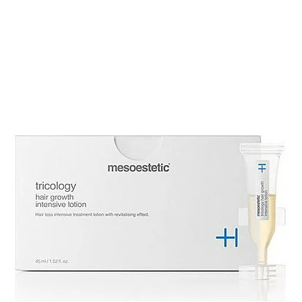 How to use Mesoestetic Tricology Hair Growth Intensive Lotion? 1 package = 1 month of treatment. Apply at night 1 monodose, at the root of the dry scalp and massage with gentle and circular movements throughout the scalp until complete absorption. Monodose should be applied on alternate nights (day-yes, day-no). Wash with the Tricology Intensive Hair Loss shampoo the next morning.