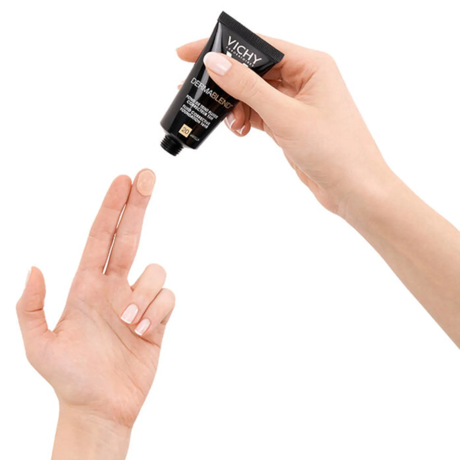 Vichy Dermablend Fluid Corrective Foundation 16H is a fluid makeup, indicated to cover minor skin imperfections (acne marks and scars) and uneven skin tones (spots, redness, and dark circles).