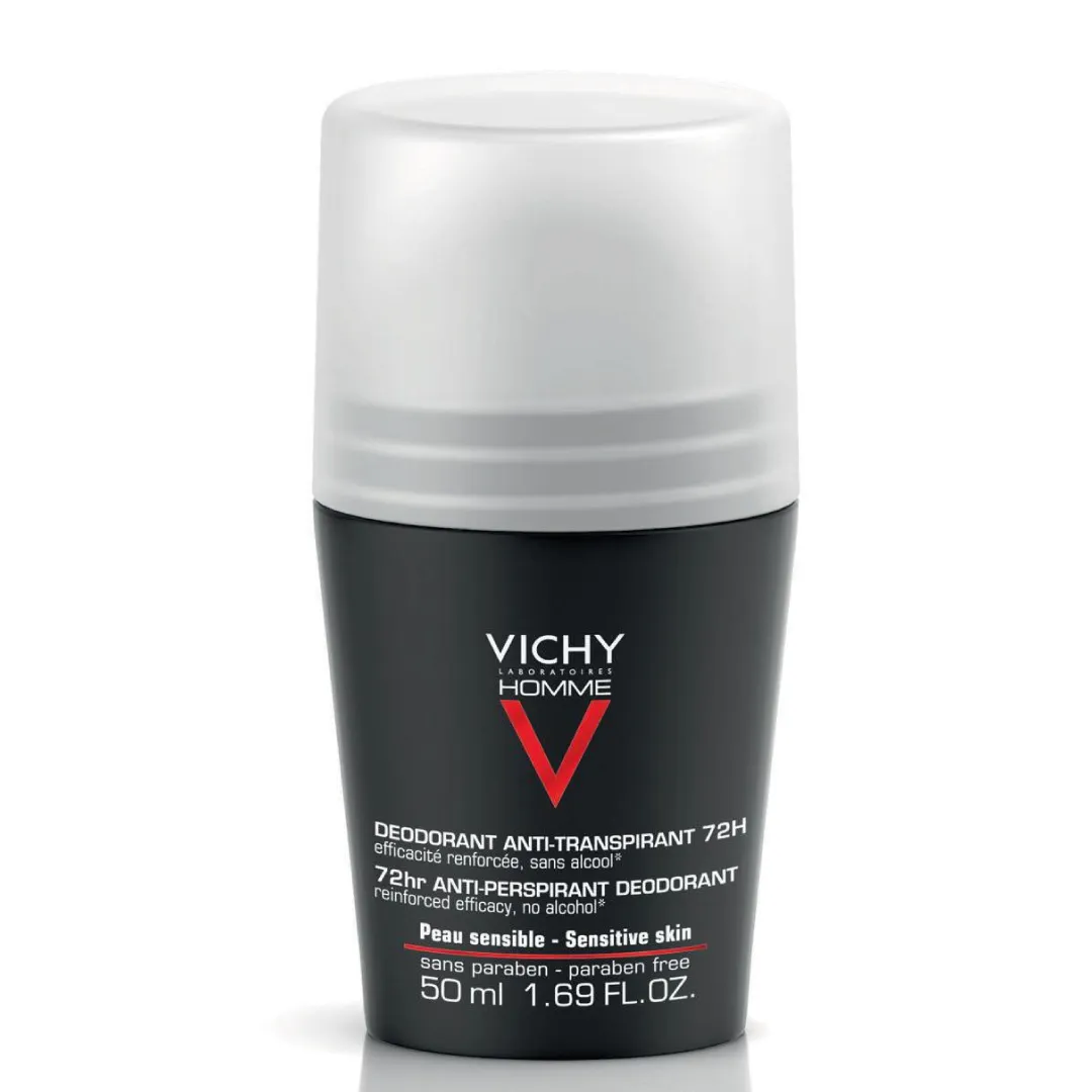 Vichy 72h anti-perspirant deodorant extreme control for man is a roll-on deodorant for men who want to control excessive perspiration, minimize white and yellow marks on clothing, as well as maintain confidence and control throughout the day. Ideal for men with perspiration spikes due to stress from work, the Vichy Homme Antiperspirant 72 hour extreme control relies on the absorbent effectiveness of Perlite which regulates intense perspiration and odor. Its formula enriched with anti-perspirant and ultra-absorbent ingredients guarantee long-lasting effectiveness without irritating the armpits or causing discomfort. Formulated without alcohol and without parabens, it leaves the skin comfortable and controlled. How to use Vichy 72h anti-perspirant deodorant extreme control for man? Apply after bath, on the skin of perfectly dry armpits. Apply every day in the morning.