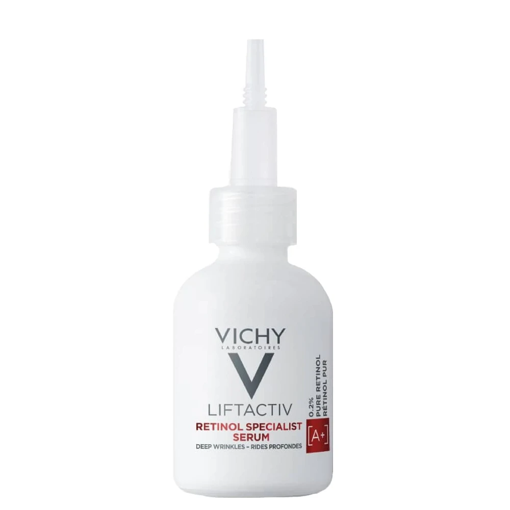 Vichy Liftactiv Retinol Specialist Serum is a night care specially developed to attenuate deep, persistent wrinkles and, as a result, restore a youthful appearance to the face. For this purpose, it is composed of 0.2% pure retinol, 1% Probiotic-derived fractions, and Vichy Volcanic Water.