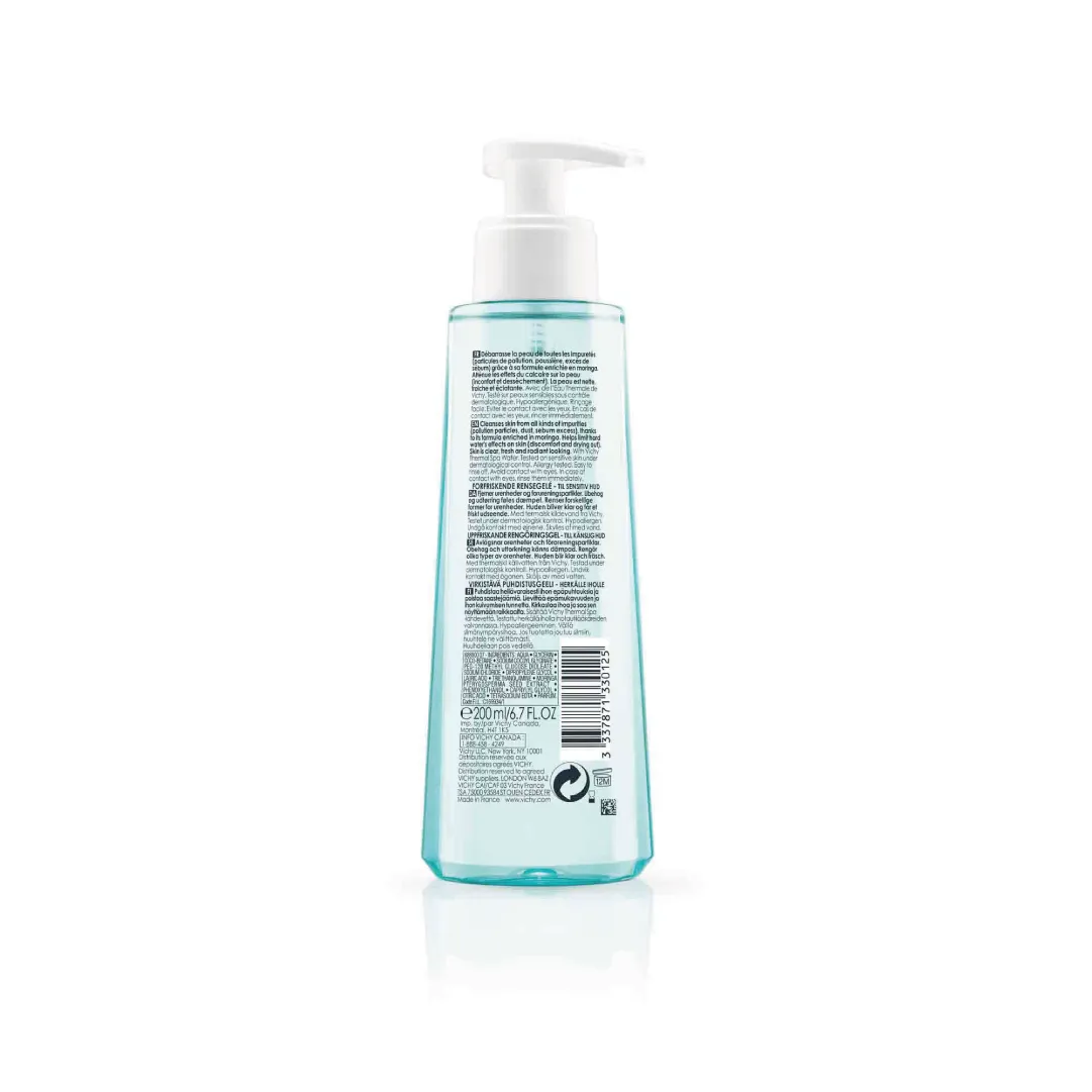 Vichy pureté thermale fresh cleansing gel for skins subject to polluted environments throughout the day, that enjoy a cleansing ritual with water. A gel enriched with Moringa and Glycerin, which removes from the surface of the skin harmful pollutants, such as cigarette smoke, cadmium and mercury, which when embedded in the skin have irritating effects.